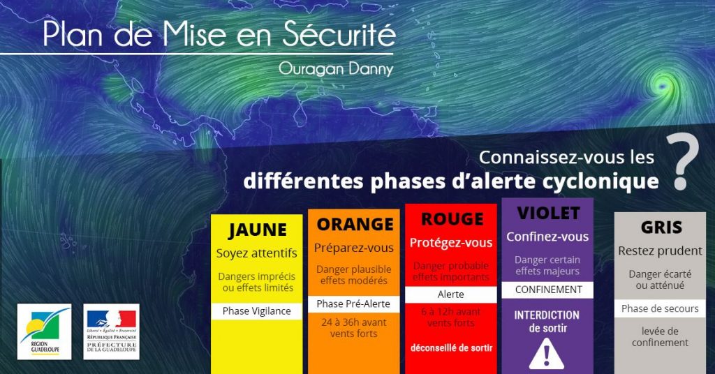 - Pour les cyclones : anticipation souvent 24–72 h selon évolution. Confinez-vous (violet)